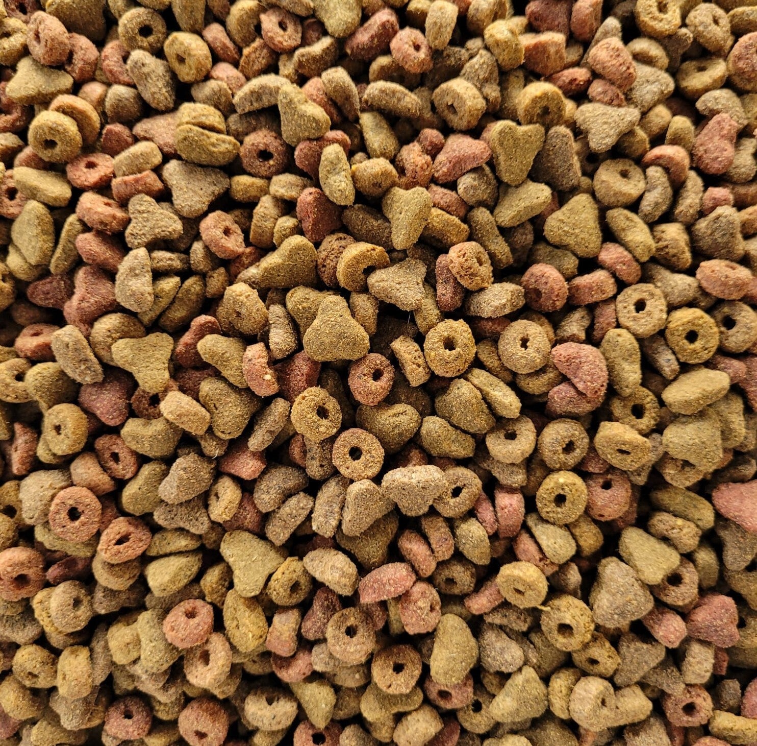 Samenstelling: Granen, vlees en dierlijke bijprodukten, Plantaardige bijprodukten, olien en vetten, mineralen, vis en visbijproducten en gist.